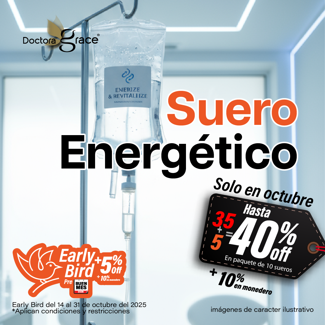 | Cantidad | Un Suero Energético 25%Off, Paquete de 3 Sueros Energéticos 30%Off, Paquete de 6 Sueros Energéticos 35%Off, Paquete de 10 Sueros Energéticos 40%Off |