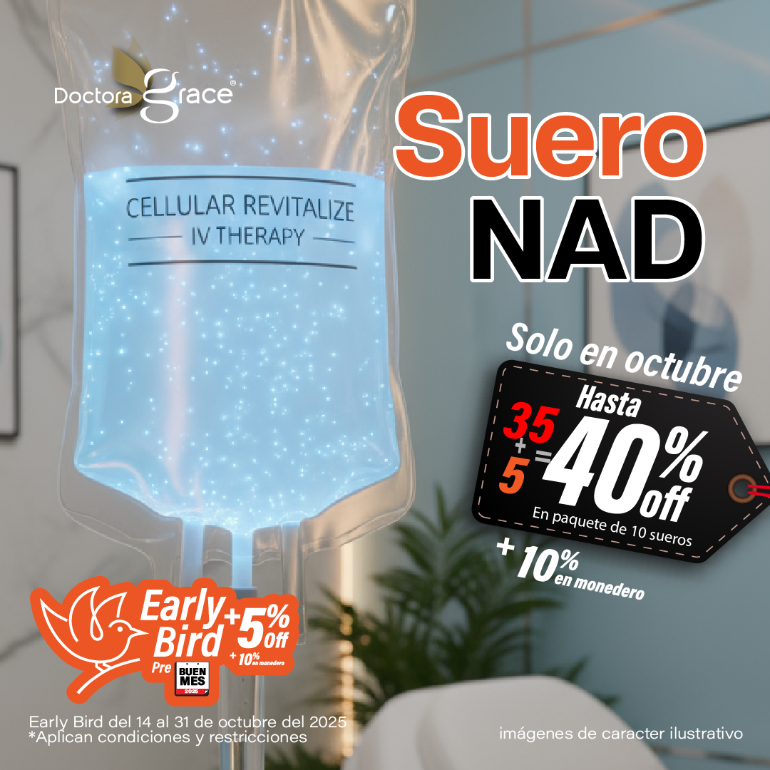 Optimiza tu bienestar con el Suero NAD, una terapia avanzada que mejora la energía celular, combate el envejecimiento y potencia tu salud. Preparado y supervisado personalmente por la Doctora Grace®.