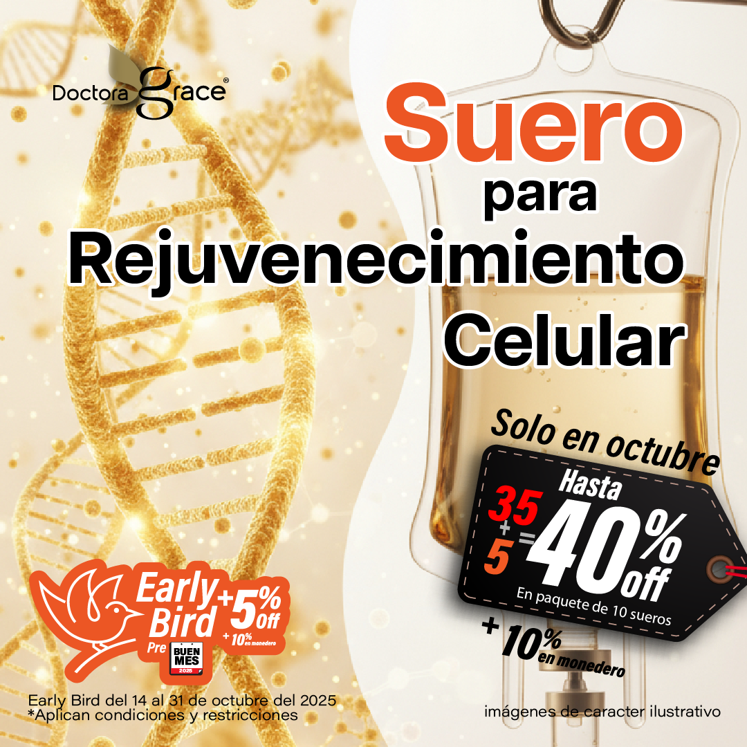 El Suero para Rejuvenecimiento Celular estimula la regeneración desde el interior. Su fórmula intravenosa con colágeno, antioxidantes y vitaminas ayuda a mejorar la firmeza, luminosidad y vitalidad de la piel.